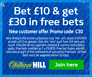 William Hill offers a decent bonus for all new players. Bet 10 €/£ and get 30 €/£ bonus in free bets. Once you place your 10 €/£ bet on odds 1/2 or higher you will receive 3x 10 €/£ free bet. Also worth mentioning that often there is a possibility to get cashback with William Hill.